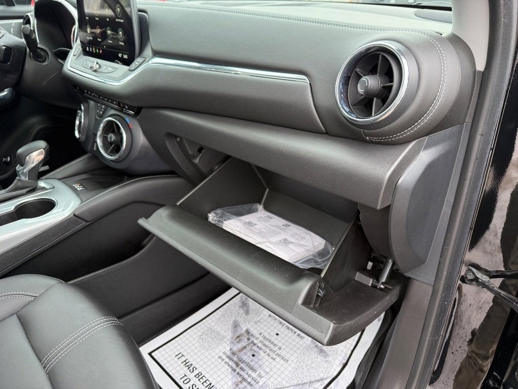 2023 Chevrolet Blazer LT AWD in Black with a Jet Black Leather interior, with 27.1k miles and a Clean CarFax Vehicle History Report available now at Cavallaro-Neubauer Chevrolet. This Chevy Blazer is equipped with the phenomenal 3.6L SIDI V6 paired to a 9-speed automatic transmission sending power to all four wheels when you need it and still getting a very respectable 26 MPG Highway on the commute. It has the right engine, all of the right creature comforts, and a sharp black-on-black color scheme accented with red in all of the right places. The front seats are heated, with a massive panoramic roof that provides ample light and airflow into the spacious and incredibly comfortable cabin. The rear hatch opens and closes with the press of a button, with rear seats that fold flat in seconds when you have bigger cargo. The rear seat legroom is phenomenal as well, with solid cargo space with the seats being occupied and there are more than enough USB and USB-C charging ports available to both rows of passengers to make sure that everyone stays connected no matter how far the road trip takes you. That can be a long way too, because this is one of the most comfortable platforms in the entire class that is loaded full of winners. Up front you have the excellent Chevrolet Infotinament 3 system that comes with native navigation, Apple Carplay and Android Auto to stream all of your calls, music, podcasts and more through an incredible Bose Sound system. There are also loads of steering wheel mounted audio controls that make sure that youre paying attention no matter how many ads you need to skip through, with crisp HD Surround vision as well to watch your back in crowded parking lots. Do not wait, this is an incredible AWD crossover with the sturdy V6 power that you are looking for and every creature comfort in the book! Do not wait, this one will not be here for long! Visit Cavallaro-Neubauer Chevrolet to take this sharp Blazer home today!